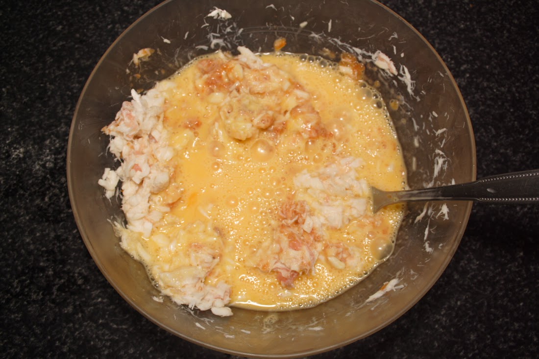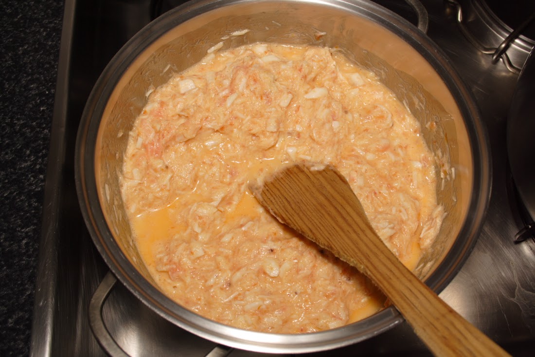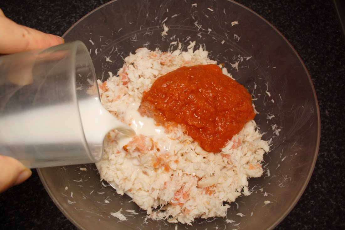 Desmigamos el bacalao, añadimos las 3 lonchas de salmón cortado finamente, lo colocamos en un bol y cascamos los huevos, batimos un poco con una varilla. Añadimos la salsa de tomate y la leche. Salpimentamos y volvemos a batir.