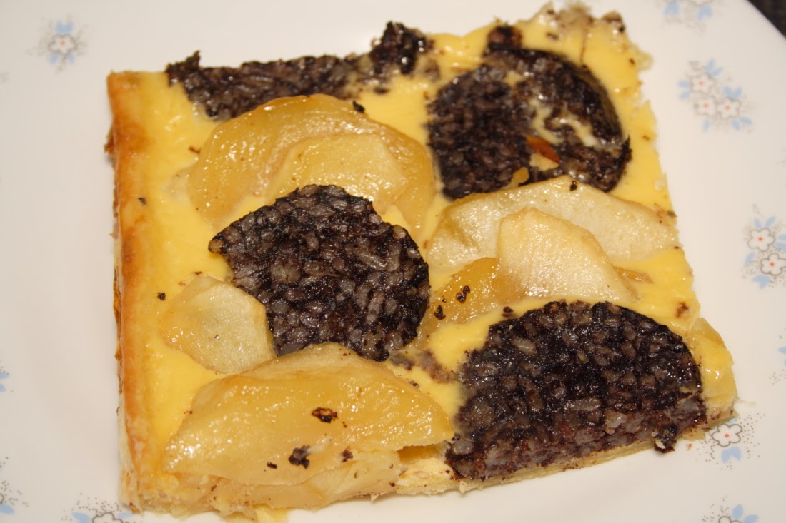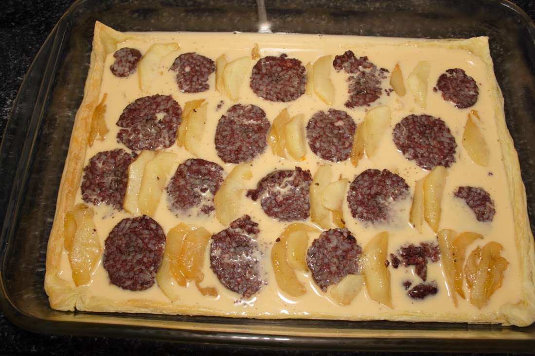 Quitamos el papel de horno y los garbanzos al hojaldre, vertemos la mezcla del bol. Colocamos de forma ordenada una rodaja de morcilla y rodajas de manzana, rodaja de morcilla y manzana…..así sucesivamente hasta cubrir toda la plancha.