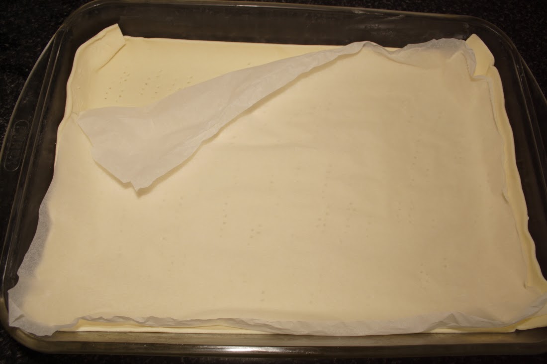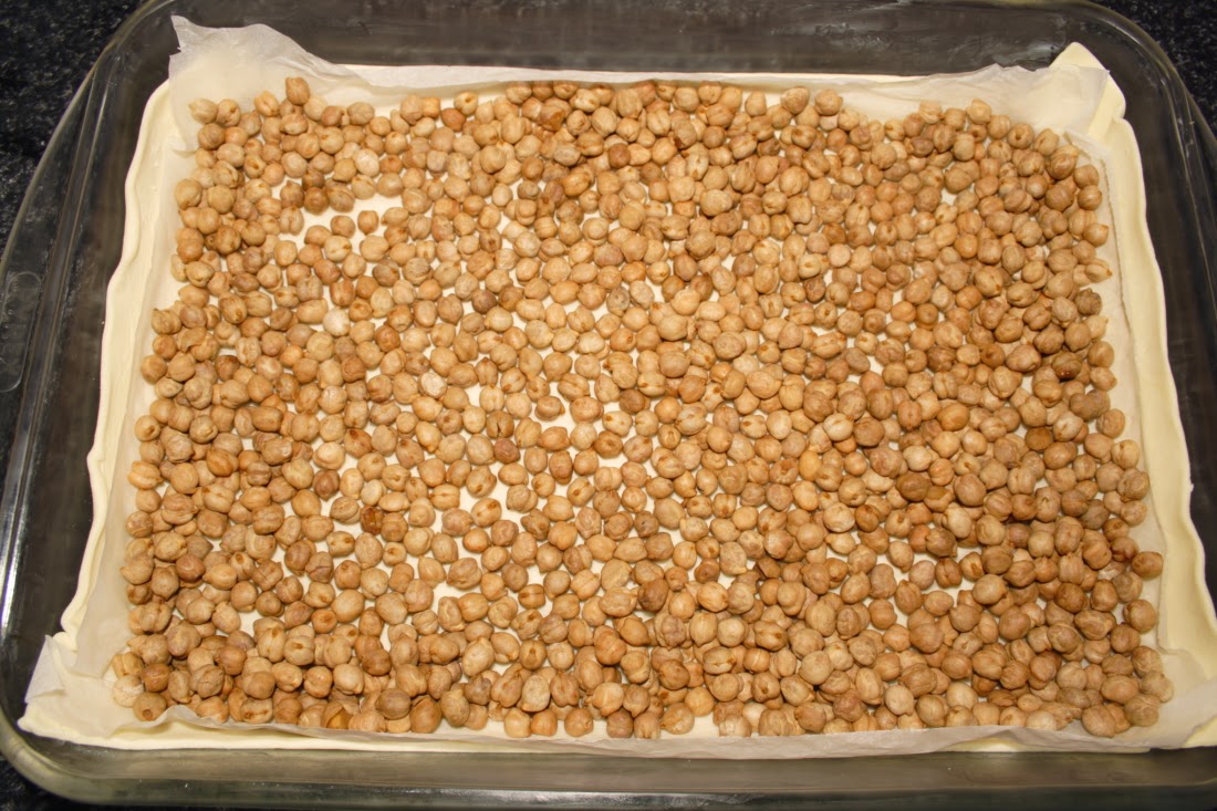 La pinchamos, solo el fondo, con un tenedor para que no suba demasiado. Ponemos papel de horno encima del hojaldre (vale el mismo que trae la masa) y unos garbanzos para que pesen, que cubran bien la plancha. Metemos al horno a 200ºC calor arriba y abajo unos 15 minutos, o cuando veáis que el hojaldre esta ligeramente dorado. Sacamos y reservamos, pero no apagamos el horno.