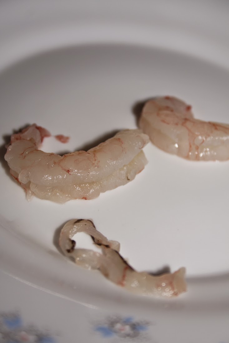 Limpiar las gambas, tanto si son frescas como congeladas, yo les quito el intestino, que es la » rayita negra» que tienen en un lateral.