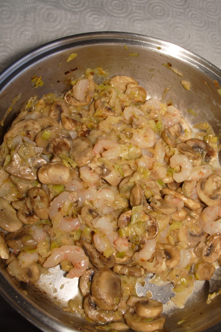 Cuando estén dorados subir el fuego y añadir los champiñones fileteados y dejar que se hagan aunque no demasiado porque se meterán en el horno. Echar la sal, la pimienta y las gambas y un poco de harina para que liguen mejor los ingredientes, si veis que os queda demasiado espeso añadir un chorrito de leche.