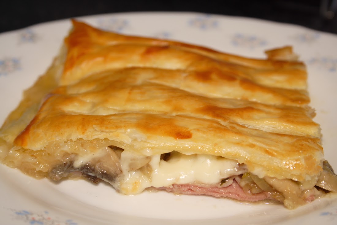 Extendemos en una bandeja de horno, sobre el papel que trae, una plancha de hojaldre y cubrimos con el jamón de York, dejando unos 2 centímetros todo alrededor sin cubrir. Sobre éste ponemos el revuelto de cebolla y champiñón, procurando repartirlo bien sobre el jamón. Hecho esto, cubrimos todo con el queso.