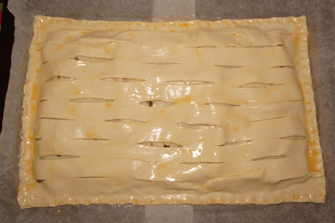 Extendemos la segunda plancha de hojaldre, con el papel que trae, sobre la mesa, y le vamos dando unos cortes intermitentes (como indico en la foto, parece una rejilla), no muy largos, por todo el hojaldre, procurando dejar 2 centímetros alrededor sin cortar para sellar las dos planchas de hojaldre y que no se nos salga el relleno cuando cueza en el horno.