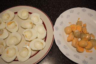 Este proceso se puede hacer el día anterior. Los pelamos, los cortamos por la mitad a lo largo, sacamos las yemas, que reservamos, y colocamos las claras en un plato o fuente donde se vayan a servir. Reservamos.