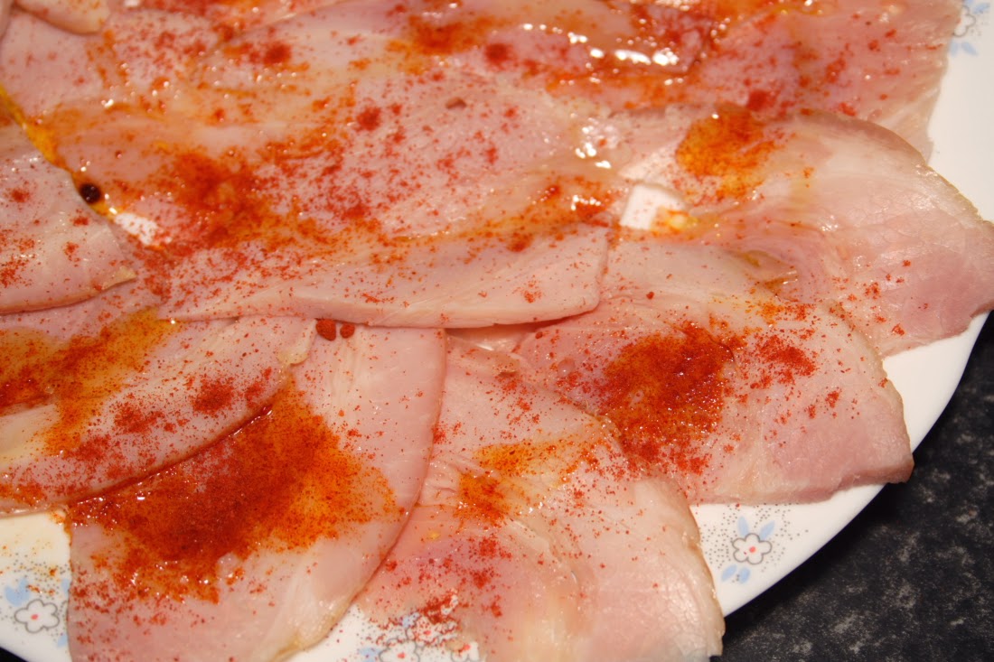 En un plato vamos colocando las lonchas finas de lacón. Ya os he dicho que la cantidad a vuestro gusto.