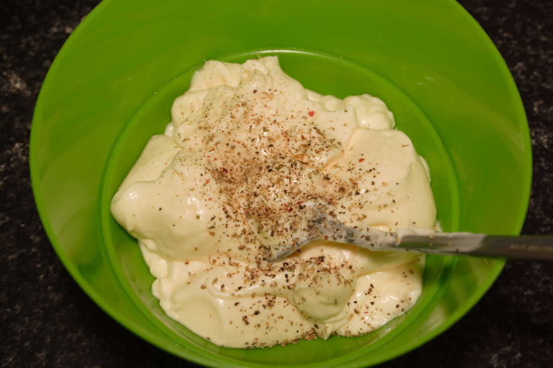 En un bol ponemos la merluza desmigada, las gambas, los palitos de cangrejo y los huevos, todo ello picadito muy fino, removemos todo para que se mezcle y le echamos la mayonesa con un poco de pimienta molida.