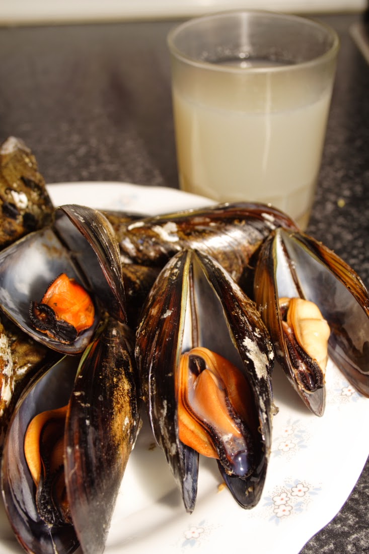 Limpiar también los mejillones y ponedlos a cocer en una olla con un chorro de vino blanco y una hoja de laurel, en el momento que se abran ya están. Una vez cocidos quitar las valvas y reservar, lo mismo que el jugo que han soltado.