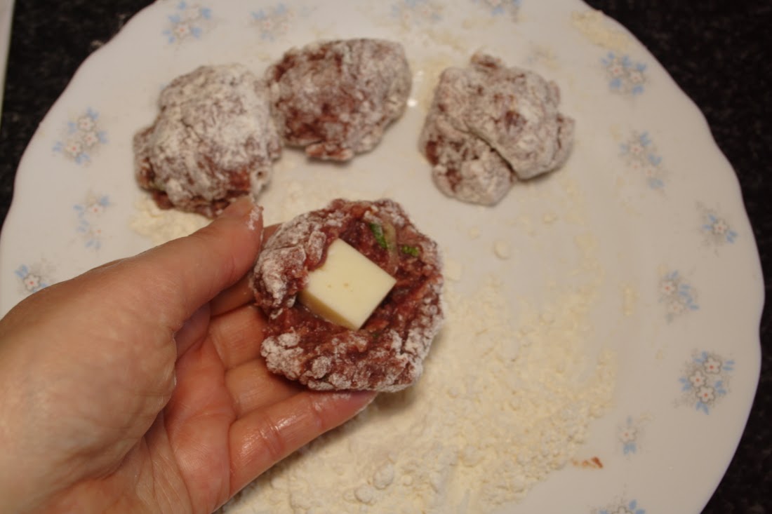 Echamos harina en un plato y vamos cogiendo la carne necesaria para ir haciendo nuestras albóndigas, de una en una, metemos un taco de queso entre la carne y le damos la forma de pelota, pasamos por la harina y ya tenemos una albóndiga lista para freír. Hacemos el mismo proceso con el resto de la carne.