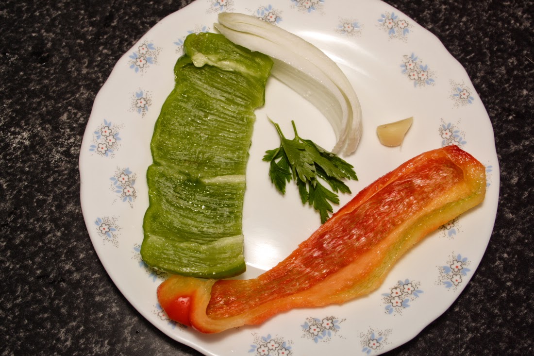 Troceamos muy menudo los pimientos, el ajo, la cebolleta y el perejil.