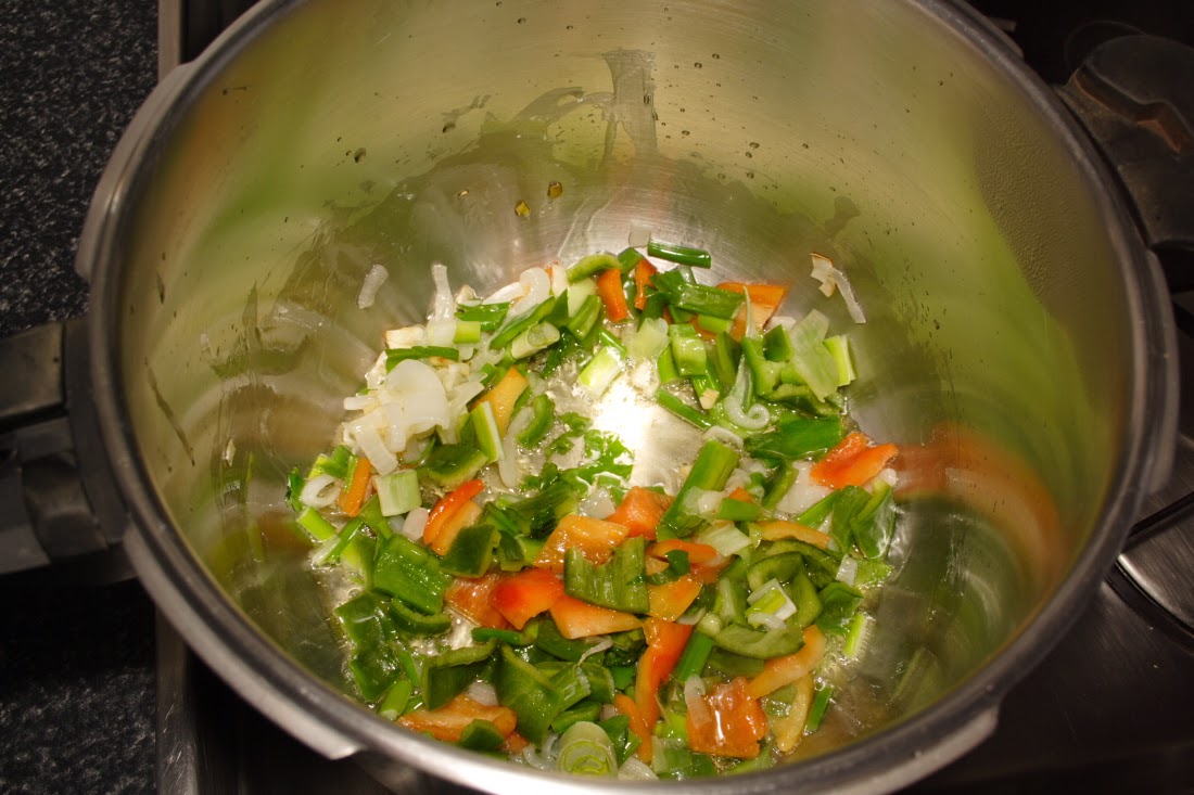 Cuando se dore añadimos los pimientos (verde y rojo), el perejil y la porreta de la cebolleta.
