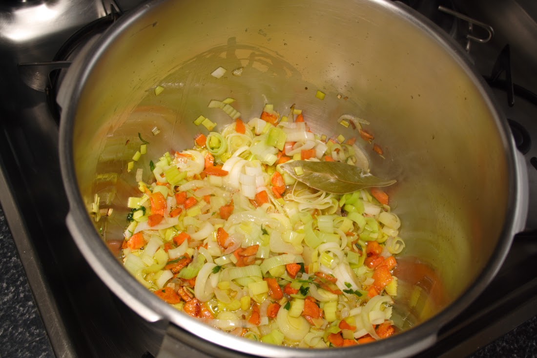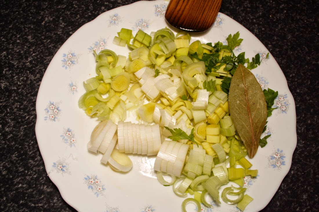 Cuando este tostadita, añadimos la cebolleta y el ajo, rehogamos todo, echamos el puerro, el perejil, el laurel y que se poche todo.