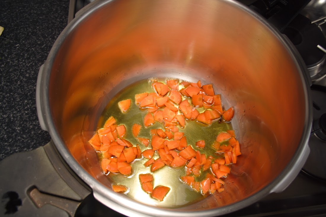 En la olla exprés ponemos el aceite de oliva, la zanahoria picada pequeña y el clavo y que se dore todo ello.