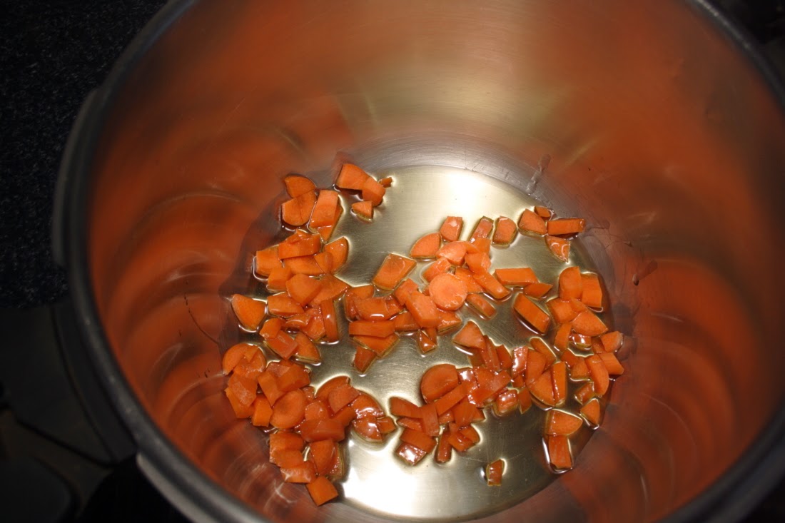 Al día siguiente la sacamos y reservamos. Troceamos la zanahoria, la cebolla, el puerro, la ramita de apio,la porreta, el tomate y reservamos. En una olla rápida con aceite de oliva, ponemos la zanahoria a dorar, cuando este añadimos la cebolla, pochamos bien y echamos el apio, la porreta y el puerro.