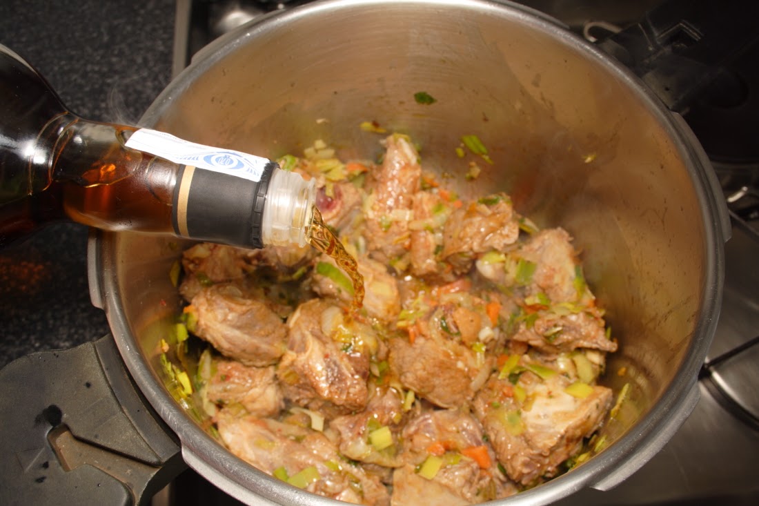 Removemos unos minutos para que se vaya haciendo y añadimos el tomate. Dejamos que se haga todo unos minutos y ahora echamos la costilla con todos sus ingredientes. Removemos bien, dejamos unos ocho minutos que se mezcle todo y vertemos un buen chorro de brandy. Mezclamos durante cinco minutos mas y como será poco líquido le añadimos un vaso de agua, que cubra justo la costilla.