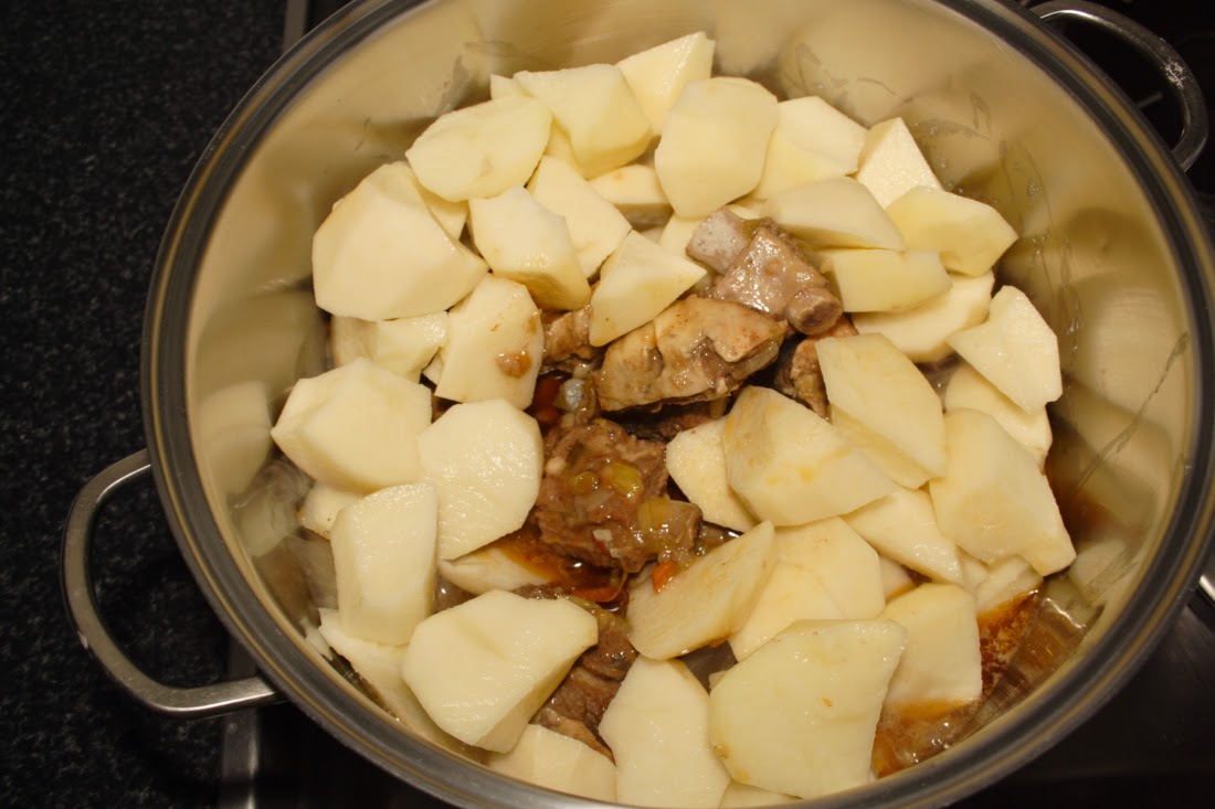 Una vez cocida, pasamos la costilla a una olla normal, donde añadimos las patatas troceadas, ponemos al fuego, removemos para mezclar todo y echamos agua hasta que casi cubra el guiso.