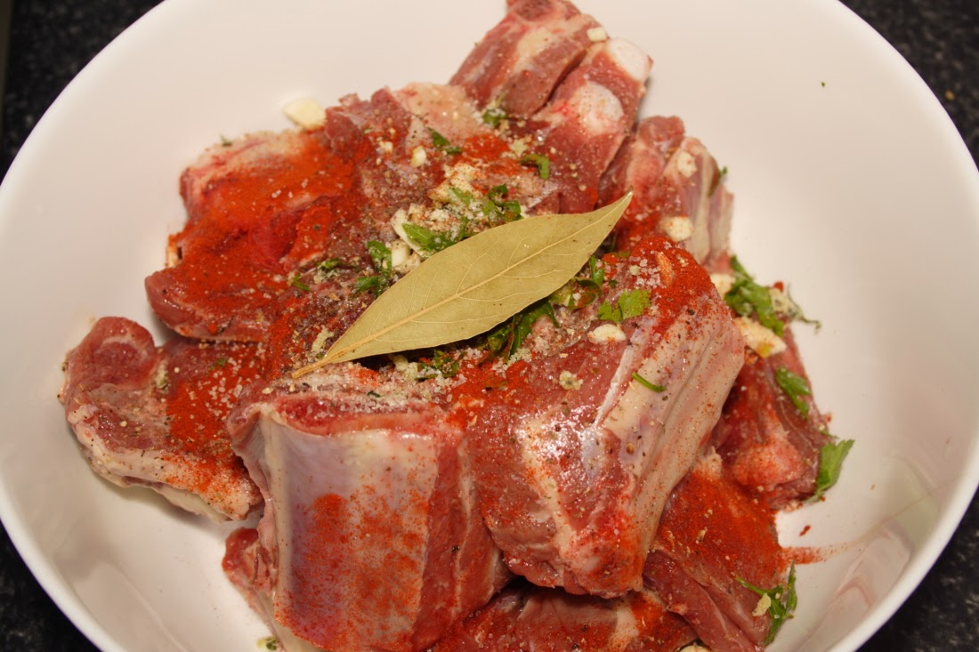 En un recipiente grande ponemos a macerar la costilla con el pimentón, el clavo, el diente de ajo y el perejil picados, sal, la pimienta y el laurel. Tapamos el recipiente y la dejamos macerando toda la noche en el frigorífico.