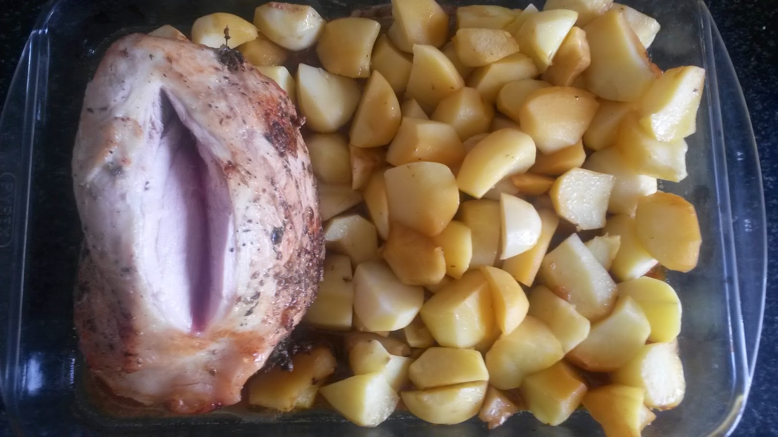 Si vemos que se ha secado el recipiente, le echamos un poco de agua, el brandy del vaso (si es que tenemos todavía) y un poco mas de aceite sobre las patatas. El recipiente del asado no debe quedarse nunca seco. Y lo volvemos a meter en el horno, durante por lo menos otra hora y media.