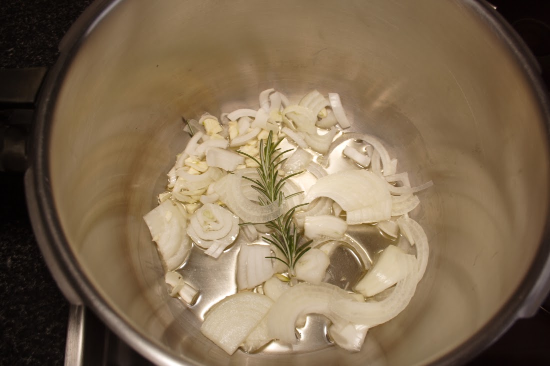 Partimos de forma menuda la cebolla y el ajo. En la olla rápida ponemos aceite de oliva y pochamos la cebolla, el ajo y el romero.