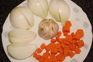 Lavamos y picamos las zanahorias en rodajas no muy gruesas, las cebolletas en cuartos (le quitamos bien la capa exterior) y la cabeza de ajo entera, le quitamos lo que podamos de piel y de raíz y reservamos.