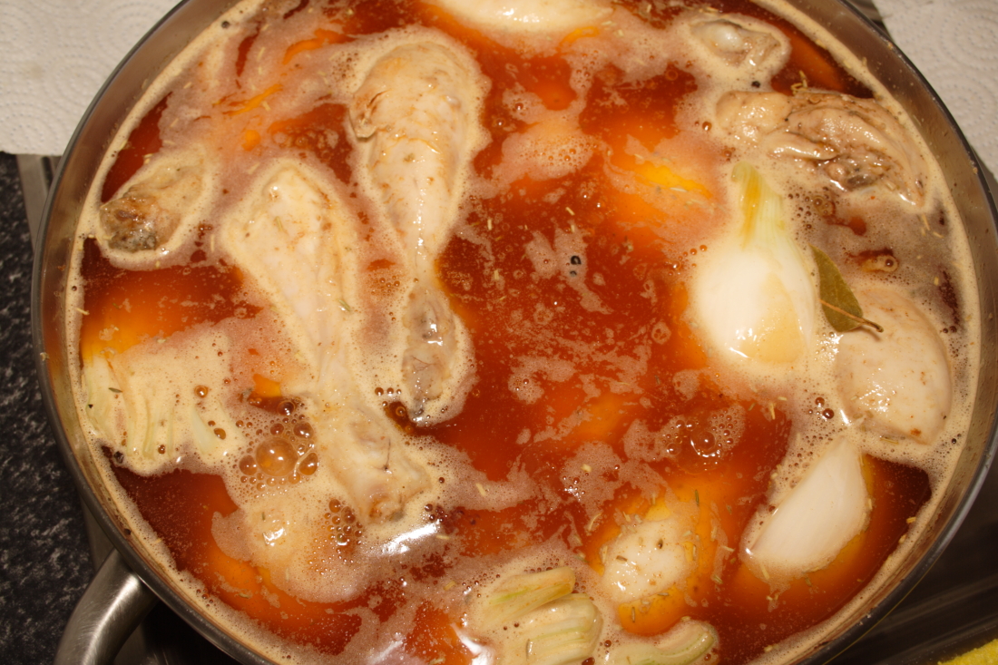 En la misma olla, añadimos el pimentón dulce y picante (ojo porque se quema) y pasamos los zancos, la cabeza de ajo, las zanahorias y las cebolletas. Agregamos el laurel, tomillo, romero y los granos de pimienta, vertemos el vinagre, el vino blando y por último el aceite de oliva. Removemos para que se mezcle todo y rectificamos de sal.