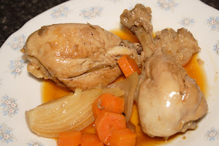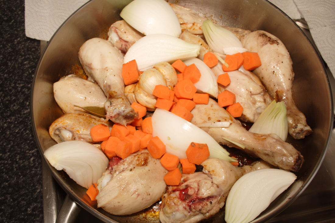 Limpiamos y pelamos los jamoncitos de pollo. Salpimentamos y los ponemos a dorar en una olla baja y ancha con aceite de oliva. Cuando se doren por todas las caras, los sacamos y reservamos.