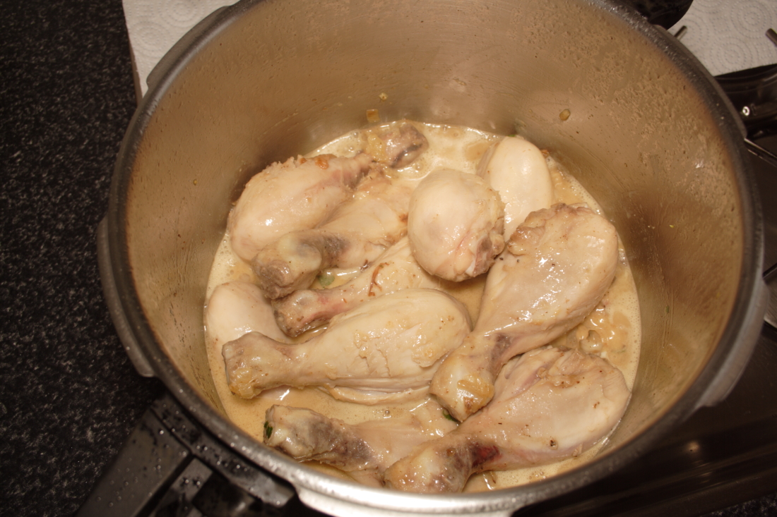 Cuando podamos abrir la olla, veremos el buen aspecto de la salsa junto con el pollo y huele que alimenta.