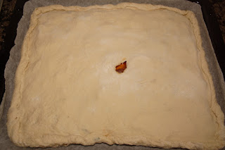 Pasamos a dar forma rectangular a la otra bola de masa, estiramos bien, que quede fina y cuando esté rectangular, tapamos con ella el relleno.