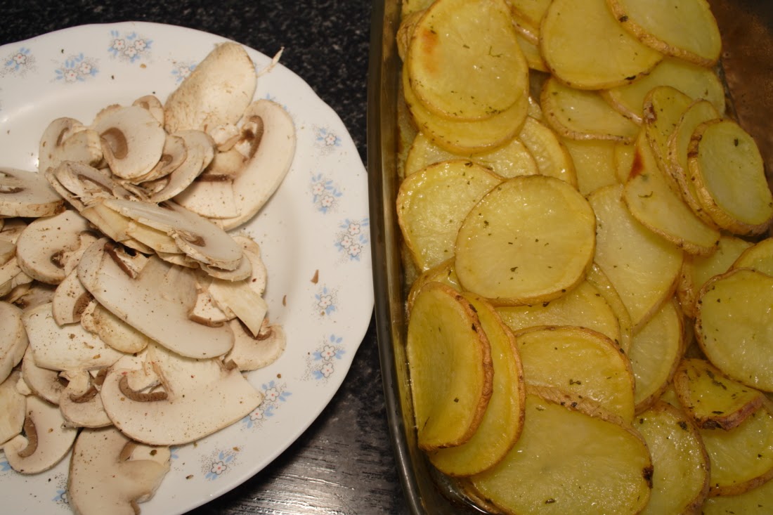 Escogemos los filetes de champiñón mas grandes, limpiamos, salpimentamos y revesamos. Lavamos bien las patatas porque las asaremos con piel, las troceamos en rodajas finas y reservamos.