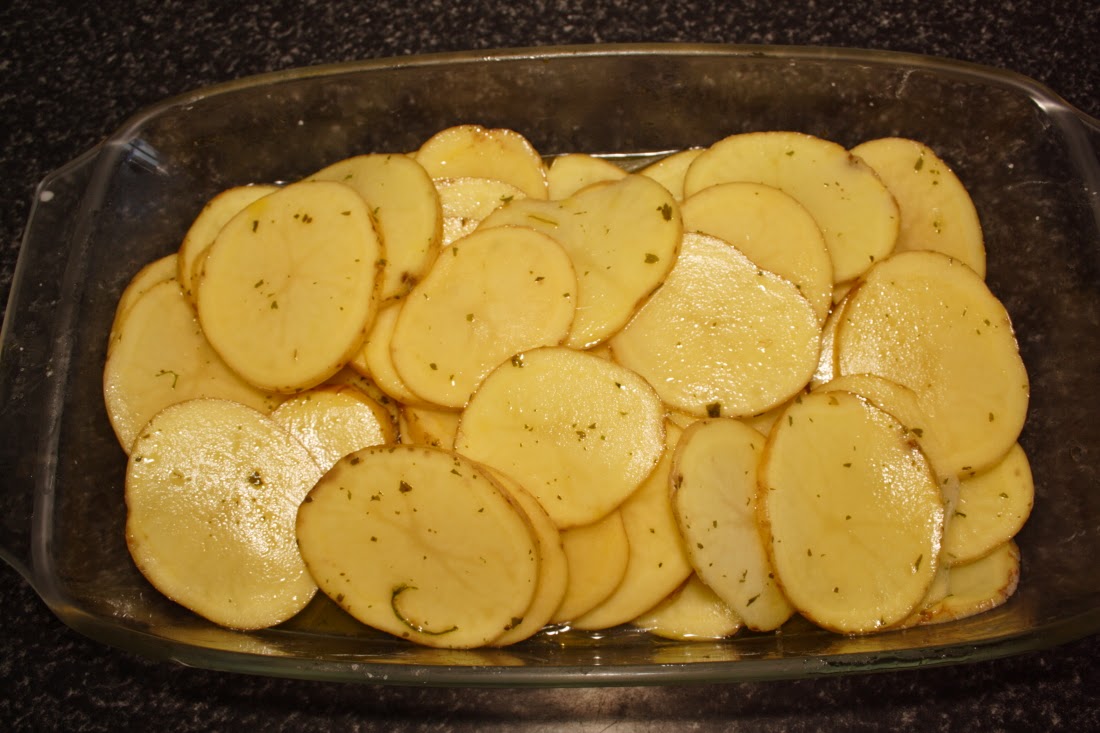 En una fuente de horno colocamos las patatas en rodajas, echamos sal y perejil picado, un buen chorro de vino blanco, otro chorro de aceite de oliva y las dejamos macerar una hora antes de hacerlas, aproximadamente.