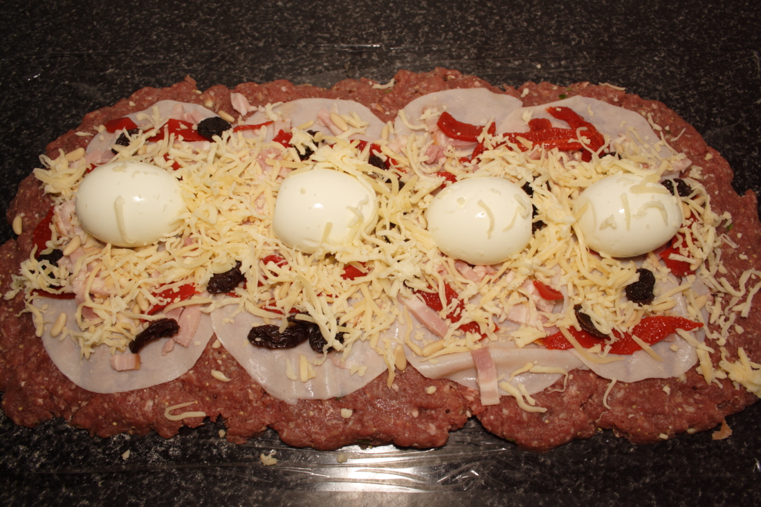 Colocamos el relleno bien repartido, pavo, bacon, huevos (si hacéis 2 rollos, 2 huevos a cada rollo), piñones, uvas pasas, queso, tiras de pimiento rojo… y lo que os guste. Ahora vamos enrollando, ayudándonos con el film, de manera que quede bien prieto. Y quitamos el film.