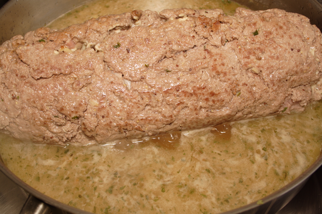 Para servir, sacamos el rollo de la cazuela, lo cortamos en rodajas y lo regamos con la salsa.