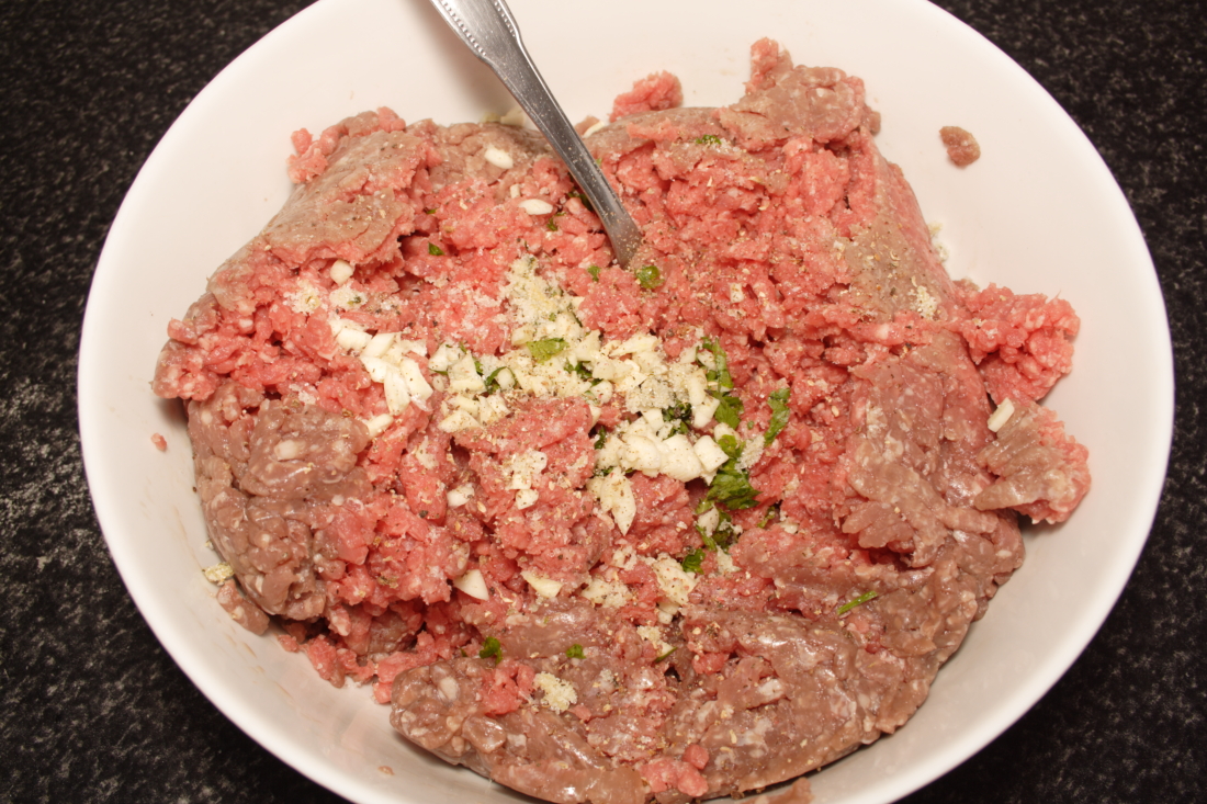 En un bol grande ponemos la carne y mezclamos bien con el perejil, los ajos picaditos, la sal, la mostaza y la pimienta. Mezclamos todo bien con un tenedor, o bien ayudándonos con las manos.