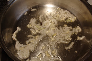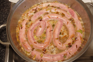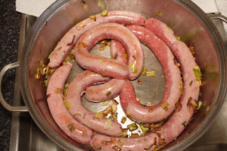 Añadimos las salchichas, les dejamos dorar por todos los lados y regamos todo con la sidra. No hace falta que las cubra. Vamos removiendo para que se mezclen los sabores y la sidra pierda el alcohol, durante cinco minutos.
