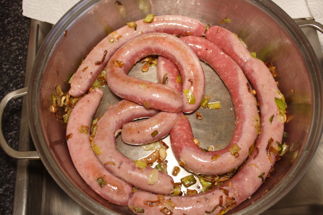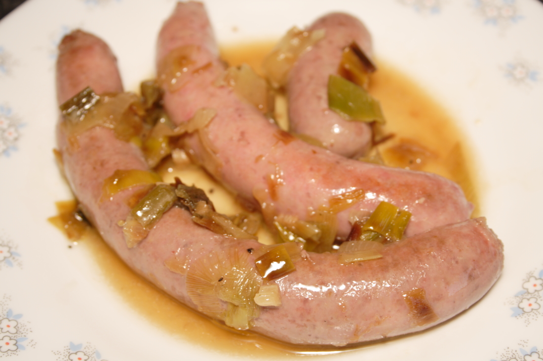 Esta es una receta de «cosecha propia». Las salchichas las he comprado en la carnicería de potro de la calle Perez Galdós. Las hacen ellos y las tienes solo de pollo y de potro con pollo. He comprado una botella pequeña de sidra natural.