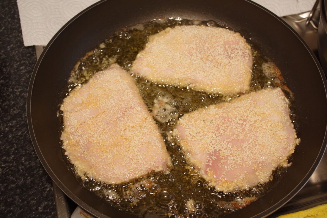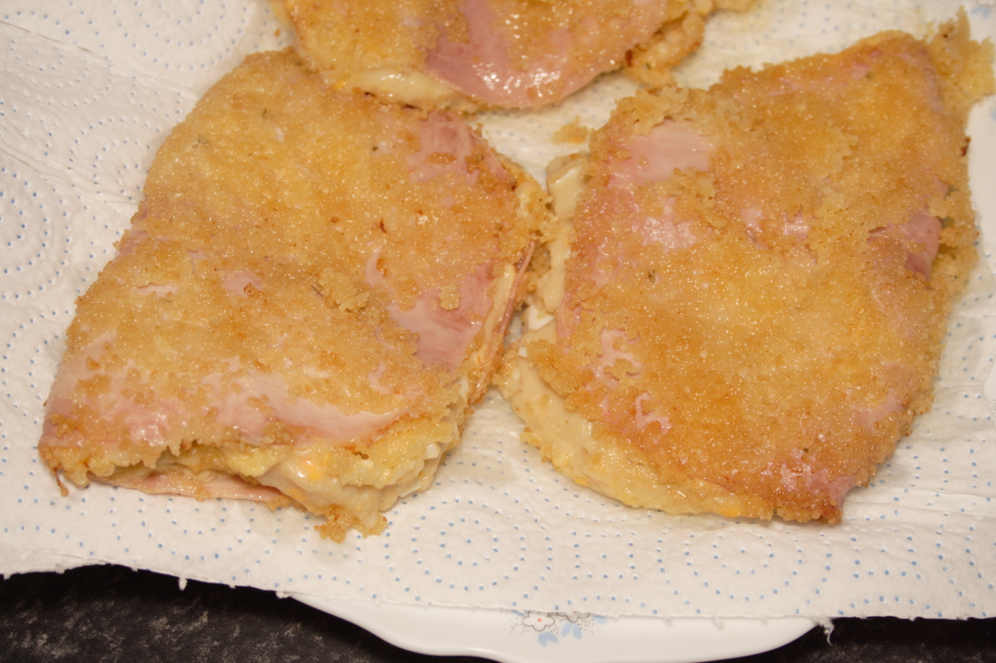 En una sartén con abundante aceite de oliva freímos nuestros San Jacobos y los escurrimos en un plato forrado de papel absorbente.