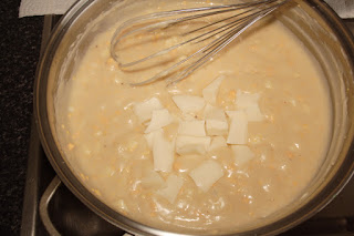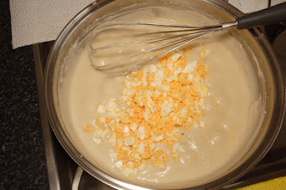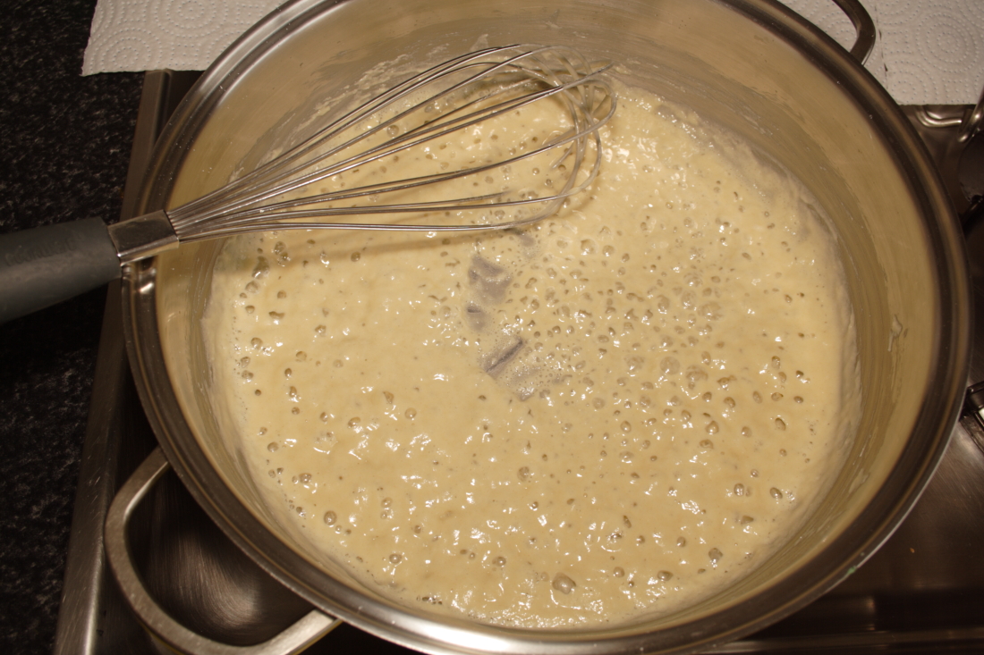 Cuando esté bien ligada, añadimos los huevos y el queso. Seguimos removiendo con la varilla con cuidado de que no se pegue al fondo de la olla.
