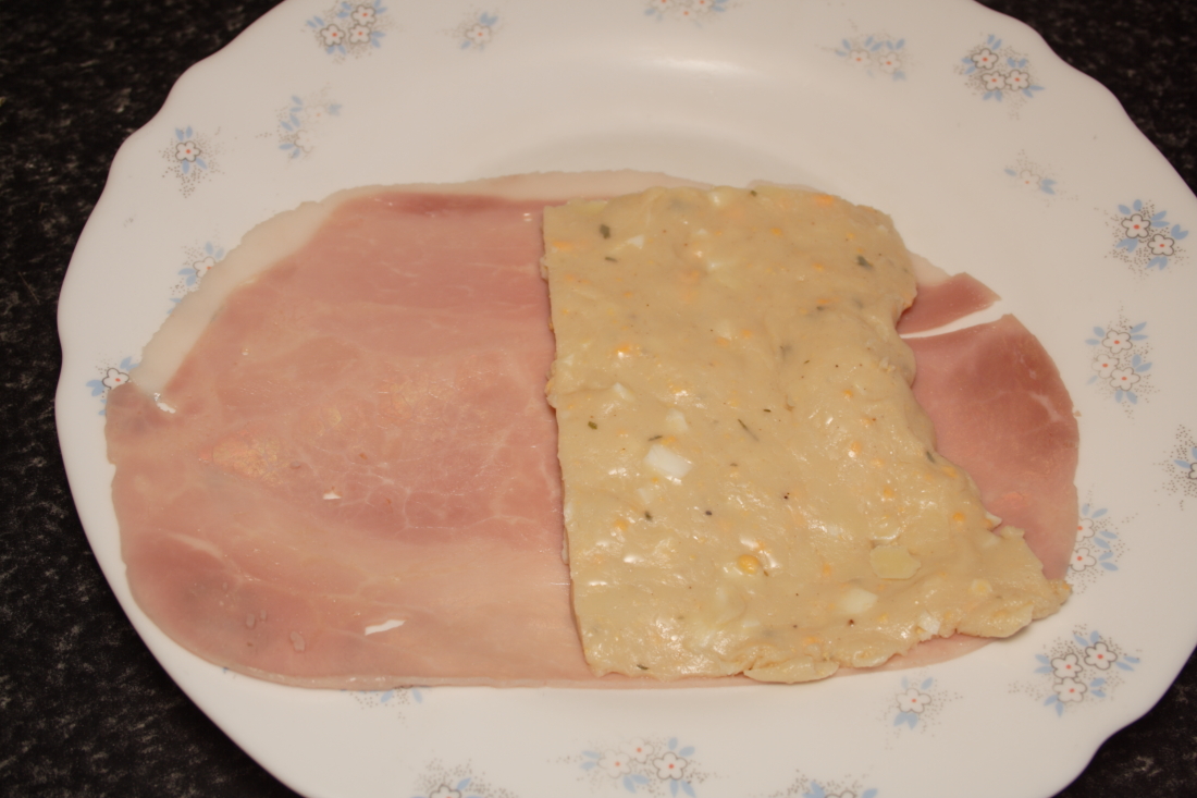 Ya fría, que se maneja mejor, cortamos en ocho porciones la besamel del tamaño de media loncha de jamón. Ponemos un trozo sobre cada loncha y la plegamos.