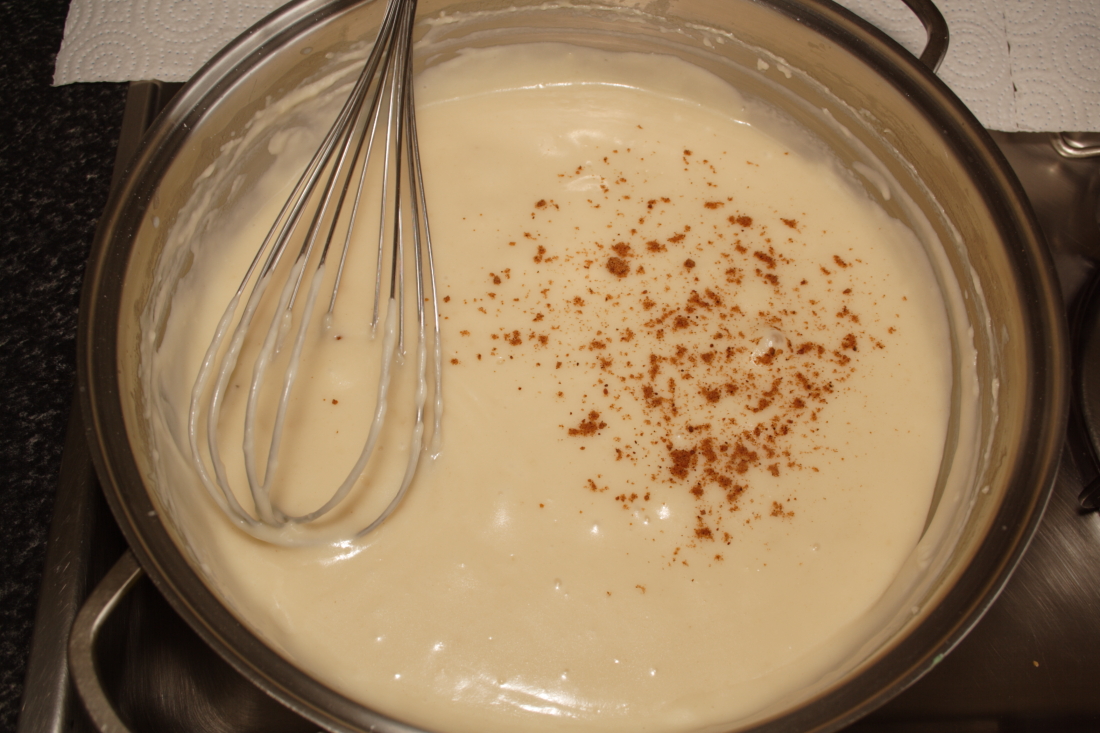 Vertemos poco a poco la leche, removemos con la varilla hasta que vaya ligando, sazonamos, echamos la nuez moscada y seguimos removiendo unos 10 minutos.