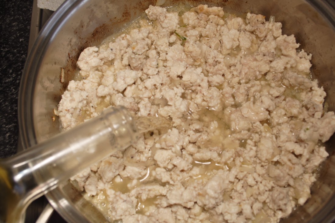 Cuando este dorada incorporar la carne de pollo picada salpimentada. Dejar que se rehogue un poco, cuando veáis que esta hecha añadir el chorro de vino blanco, dejar que se evapore y reservar.