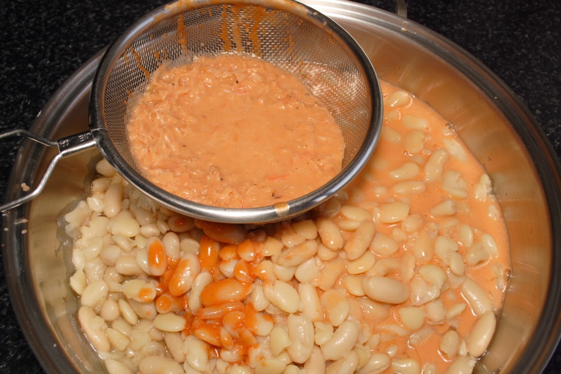 Quedará una mezcla algo espesa, ponemos en un colador y el líquido resultante, de color rosáceo, se lo echamos a las alubias. Si veis que quedan espesas añadid mas líquido de cocción.