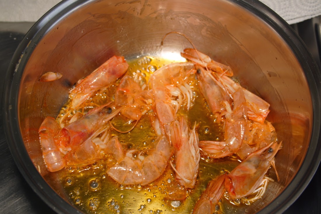 A los langostinos le quitamos las cabezas y las pieles y las ponemos en una olla con aceite de oliva. Cuando cambian de color echamos un buen chorro de brandy y flambeamos: encendemos el brandy para  quemar el alcohol y de paso se tuestan las cabezas y las cáscaras. OJO CON ESTE PROCESO, APAGAR SIEMPRE LA CAMPANA EXTRACTORA.
