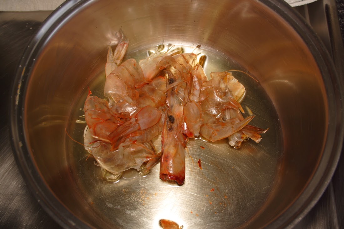 A los langostinos le quitamos las cabezas y las pieles y las ponemos en una olla con aceite de oliva. Cuando cambian de color echamos un buen chorro de brandy y flambeamos: encendemos el brandy para quemar el alcohol y de paso se tuestan las cabezas y las cáscaras. OJO CON ESTE PROCESO, APAGAR SIEMPRE LA CAMPANA EXTRACTORA.