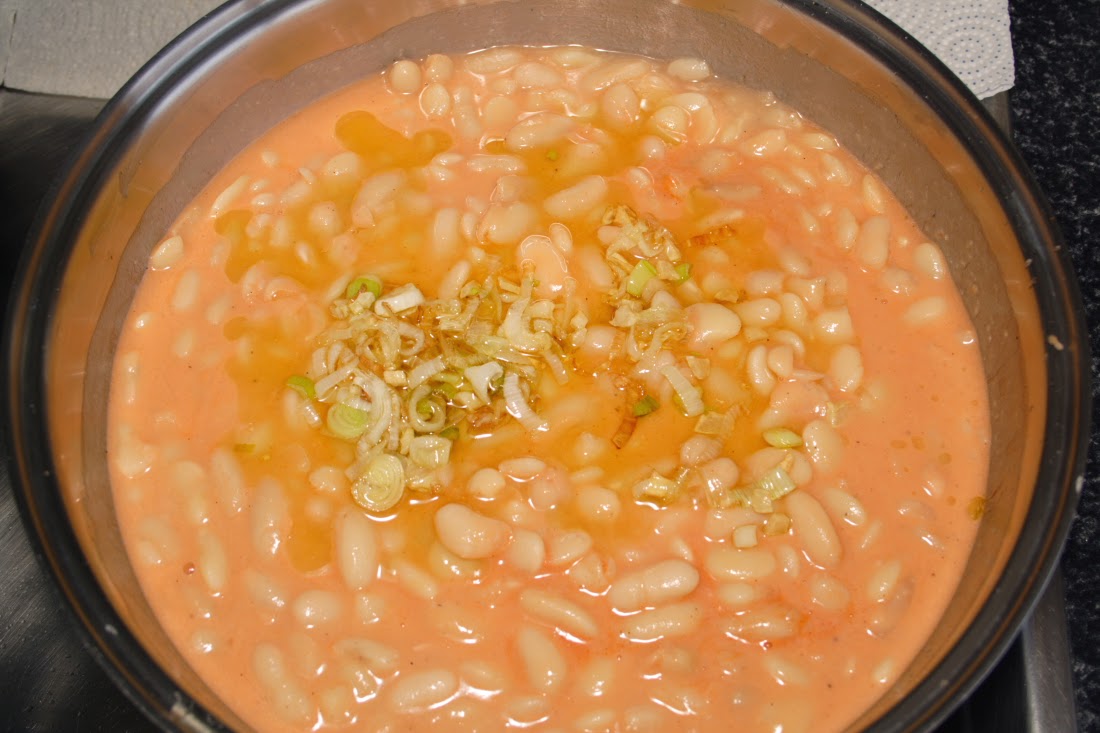 Aquí lo podéis hacer de la forma fácil: compramos las alubias preparadas. O sino las ponemos a remojo la noche anterior y las cocemos en la olla rápida con agua y sal durante 35 minutos. Una vez cocidas escurrimos y reservamos también el caldo de cocción.