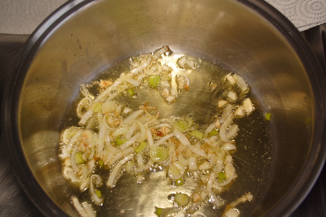 A continuación en una olla ponemos a pochar en aceite de oliva, la cebolleta y el ajo, cuando se doren vertemos todo sobre las alubias y es ahora cuando valoramos el color que han cogido.