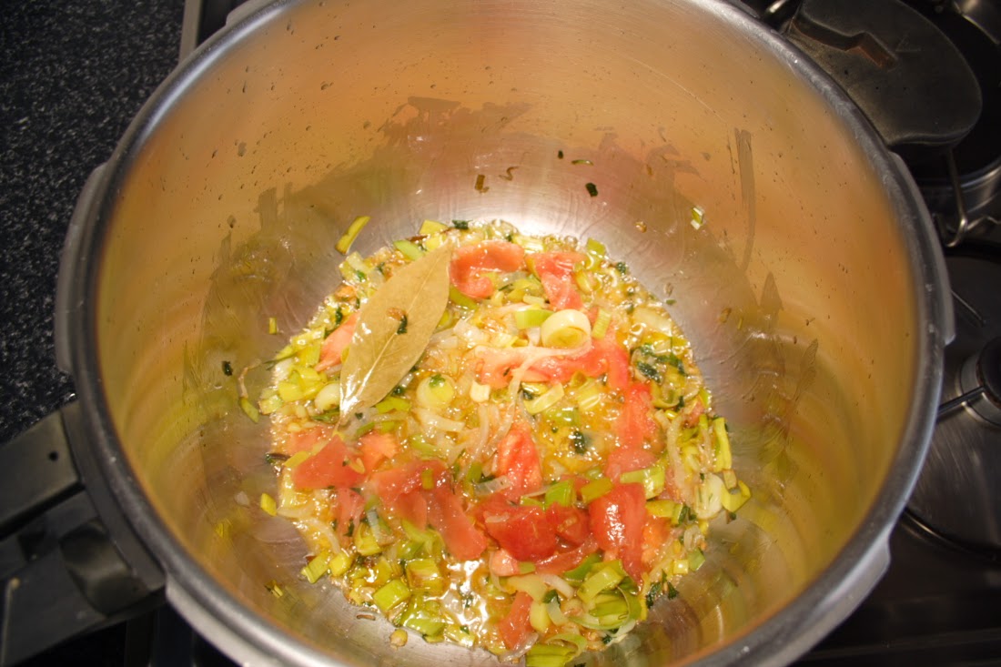Limpiamos bien los calamares, los troceamos en trozos no muy pequeños, sazonamos y reservamos. Limpiamos también las verduras y el tomate, los troceamos finamente y reservamos.En la olla exprés ponemos aceite de oliva y pochamos la cebolleta, el ajo y el clavo. Cuando estén dorados añadimos el puerro, el laurel y el perejil, sazonamos, seguimos dorando y cuando coja todo color añadimos el tomate.