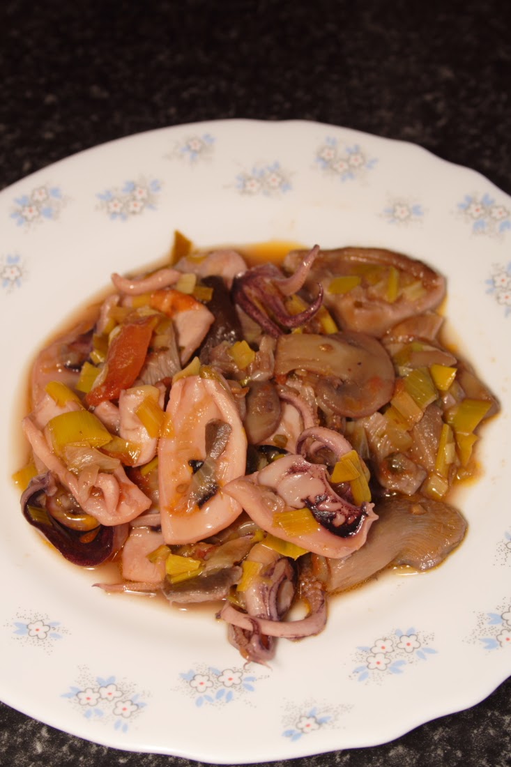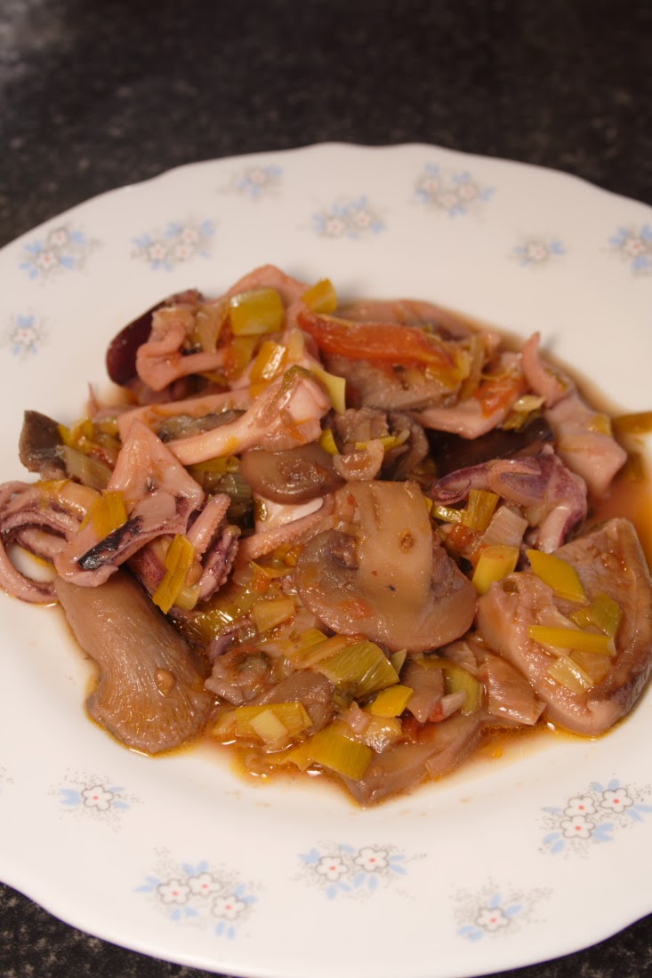 Removemos todo para que se rehogue, subimos el fuego y ponemos los calamares. Con el fuego fuerte removemos y cuando los calamares empiecen a blanquear, echamos las setas (sin descongelar), removemos un par de minutos y echamos el chorro de vino blanco, lo suficiente para que la salsa llegue al ras de los calamares, seguimos removiendo y tapamos la olla.