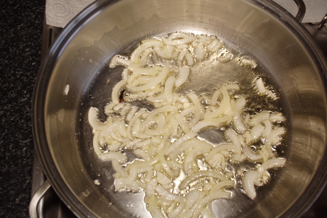 Cortar menuda la cebolleta y el ajo, pocharlos en una olla con aceite de oliva. Cuando estén dorados añadir la tinta, dar vueltas para que se rehogue un poco, añadir una cucharada sopera no colmada de harina y seguir removiendo para que se haga la harina.