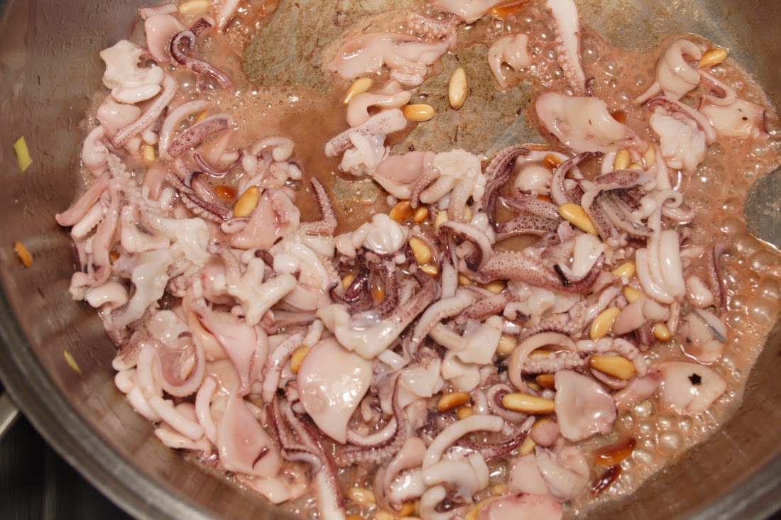 Cuando estén doradas añadir los piñones y que se tuesten. Una vez tostados, añadir las patas y las aletas de los calamares muy troceaditas para que se hagan rápido y poner el fuego fuerte.