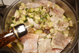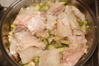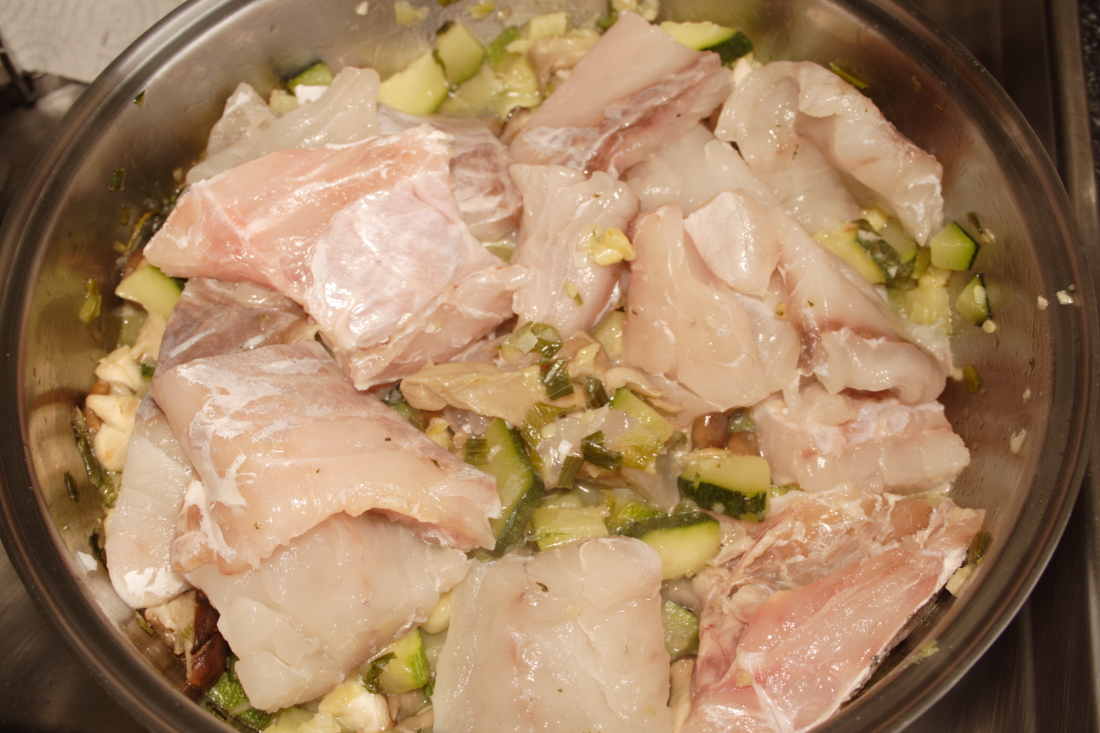 Partimos los lomos de la corvina en trozos no muy grandes, sazonamos y reservamos.