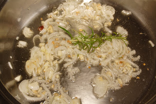 En una olla baja y ancha, ponemos aceite de oliva y pochamos la cebolleta, el ajo, la cayena y el romero.